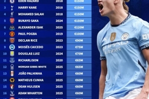 英超各队球员历史最高身价排行:哈兰德2亿欧居首,4人1.5亿欧