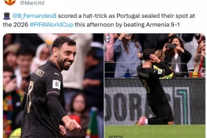 曼联官推也晒出B费庆祝进球照片,配文写道:“在葡萄牙9-1击败亚美尼亚的比赛中B费上演帽子戏法,葡萄牙也锁定世界杯参赛名额。”