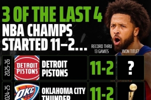 体育资讯11月17日讯 活塞媒体Pistons Talk晒出了一个惊人的巧合数据,近4年的NBA总冠军中,有三支球队在当赛季开局都是11胜2负,唯有22-23赛季的掘金例外。