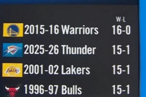 本赛季开始前16场,雷霆取得了15胜1负的战绩,这是过去30年来卫冕冠军在第二个赛季取得的并列第二好的战绩,仅次于2015-16赛季的勇士(16胜0负)。