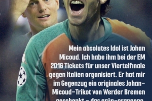 克罗斯还讲述了他与米库交换礼物的事情:“2016年欧洲杯在法国举行时,我为他安排了我们对阵意大利的四分之一决赛门票。作为回报,他送给我一瓶他自己种植的葡萄酒和一件当年他在不莱梅穿的原版球衣。”