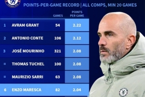 切尔西各项赛事队史场均拿分榜:至少执教20场比赛