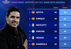 自阿尔特塔率阿森纳欧冠首秀以来主帅积分榜: