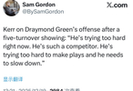 科尔在谈到格林出现五次失误后的进攻表现时表示:“他现在打得太刻意了。他好胜心太强,总想强行创造机会,需要让自己慢下来。”