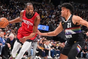 这套单侧边线启动、吸注意找弱侧套路一开,掘金夹击轮转都慢一拍了。虽然今天杜兰特有精彩的半场破领防游动中投,但火箭今天的传球真开了。