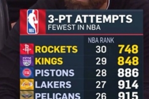 火箭客场挑战国王,转播方给出统计,本场比赛之前,火箭本赛季三分出手748次联盟倒数第一,国王848次倒数第二。