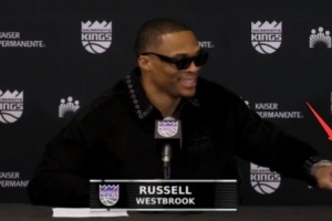 赛后,威少戴着墨镜参加新闻发布会,看起来心情很不错,他貌似还带着一节双节棍参加发布会,当记者问这是不是双节棍时,威少笑了笑没有回答,继续接受采访。
