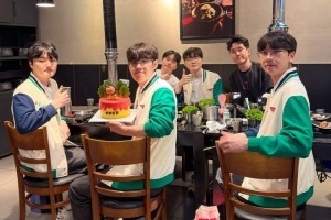 照片中,Oner拿着生日蛋糕,Faker依旧经典点赞手势👍