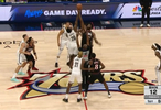 乔治把球投在篮脖子上,双方跳球!