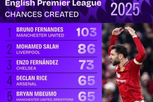 体育资讯1月1日讯 Squawka统计2025年英超球员创造机会榜,B费103次居首,萨拉赫第二,恩佐第三。