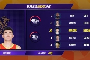 在浙江方兴渡与北京北汽的强强对话中,主场作战的浙江方兴渡以77-74险胜对手,将连胜场次扩大到8场。球队外线核心孙铭徽出战32分04秒,送出11次助攻。此役过后,孙铭徽职业生涯总助攻数达到2658次,超越郭艾伦、升至CBA历史助攻榜第三位。